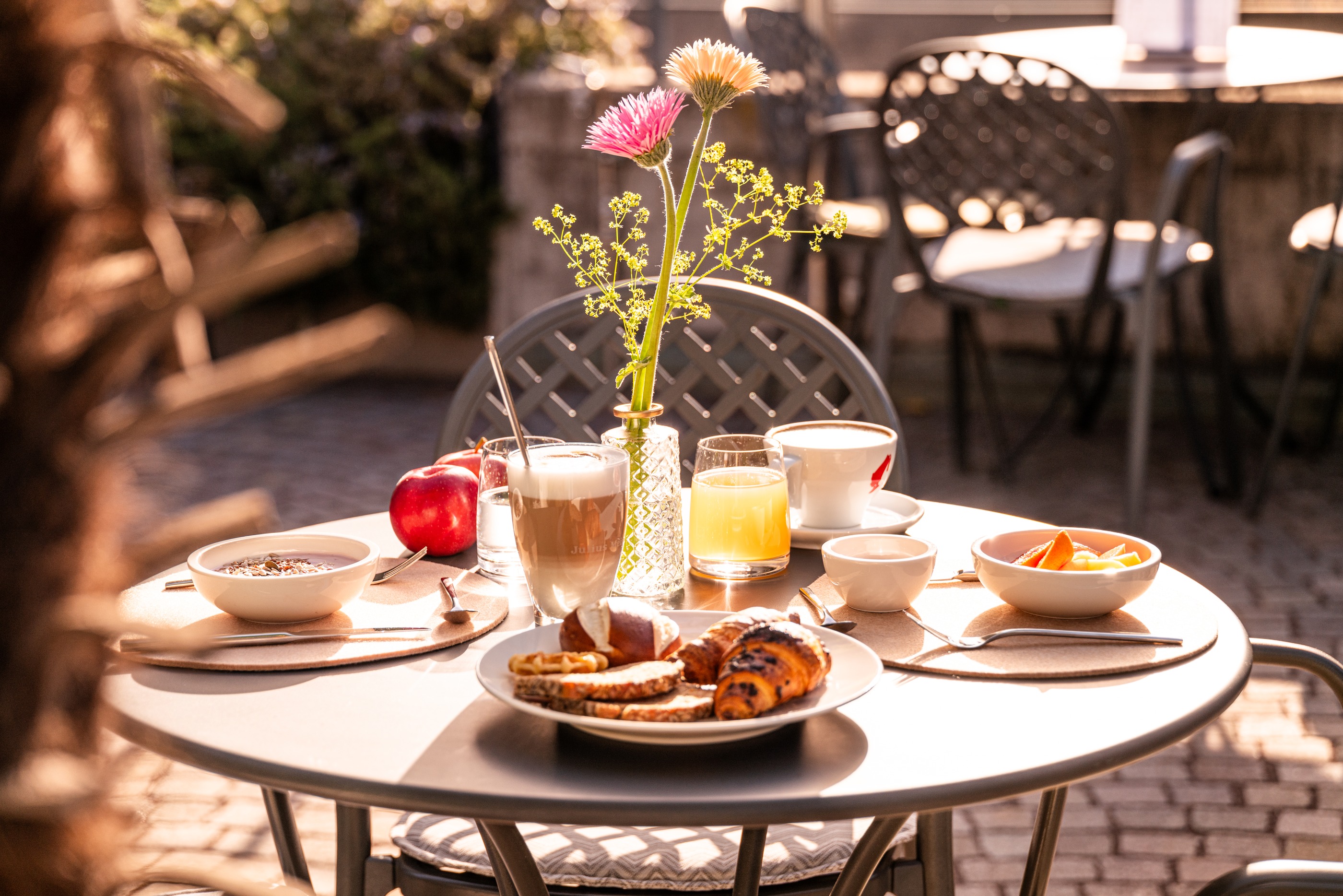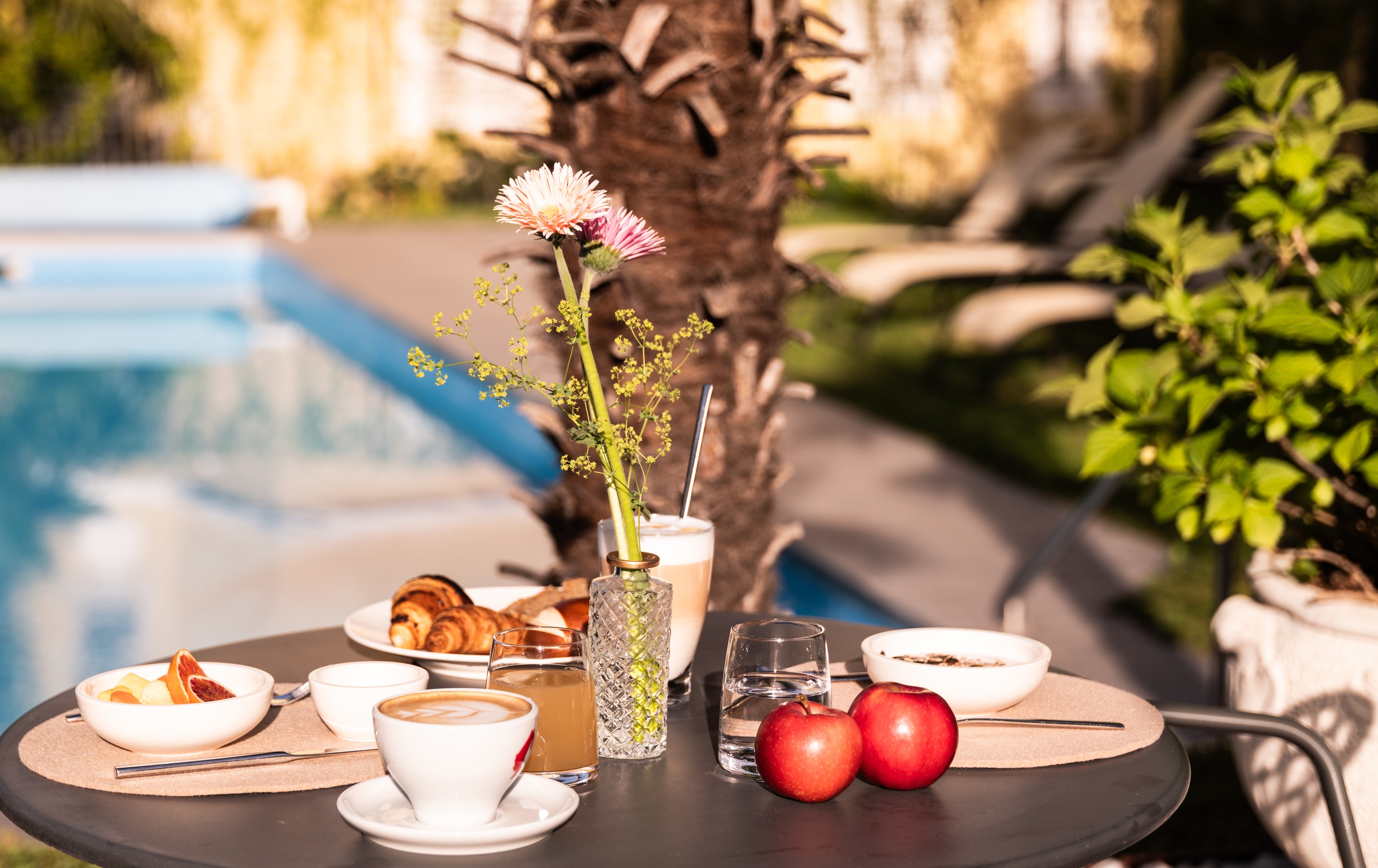 Das vielfältige Buffet mit regionalen Produkten wird im sonnendurchfluteten Frühstücksraum oder auf der Gartenterrasse am Pool serviert.